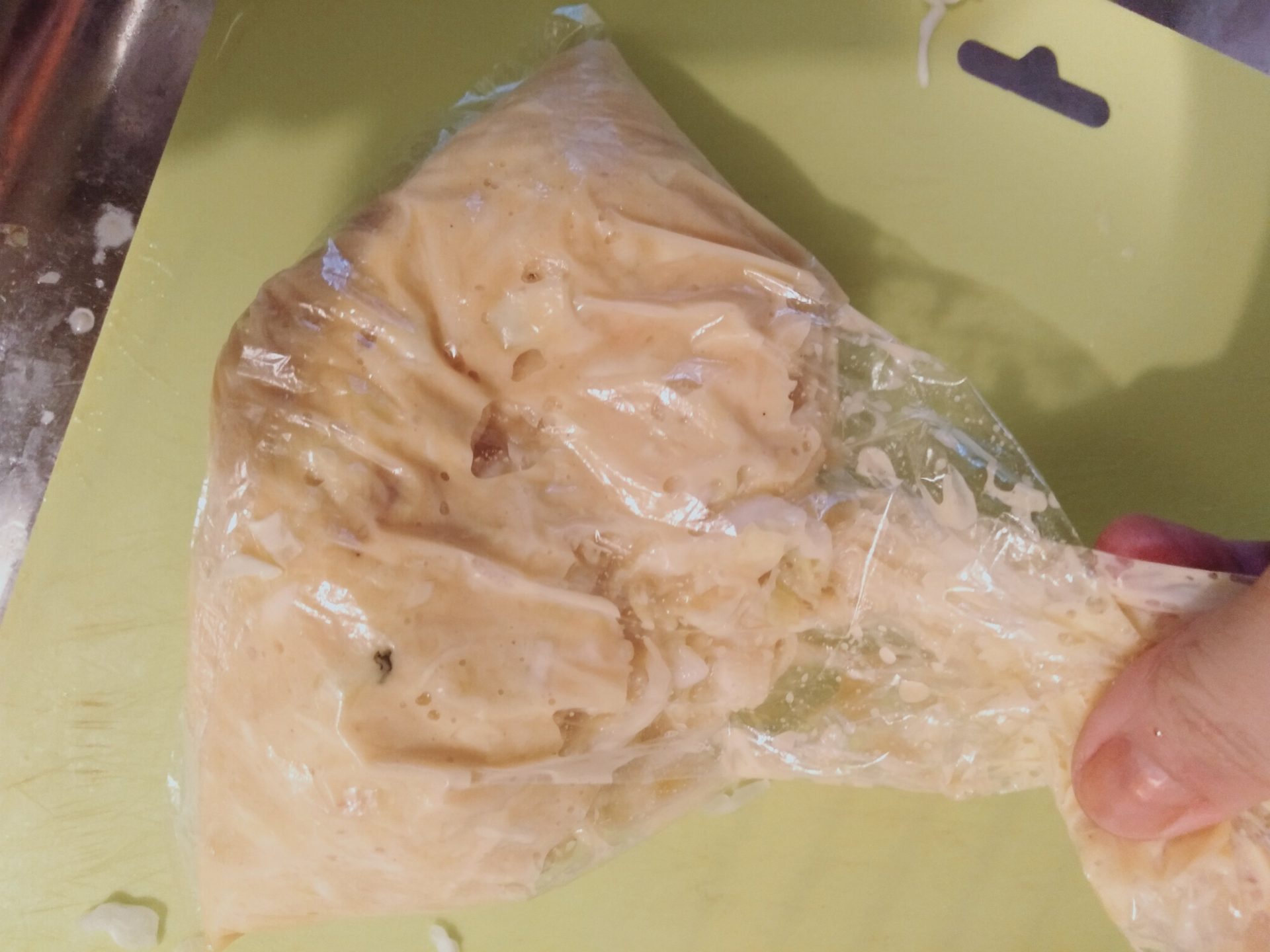 ついでにお好み焼きを一人分作るときは、写真のように、ビニール袋具材をいれて混ぜ合わせると、洗い物も少なく、簡単にできます^^