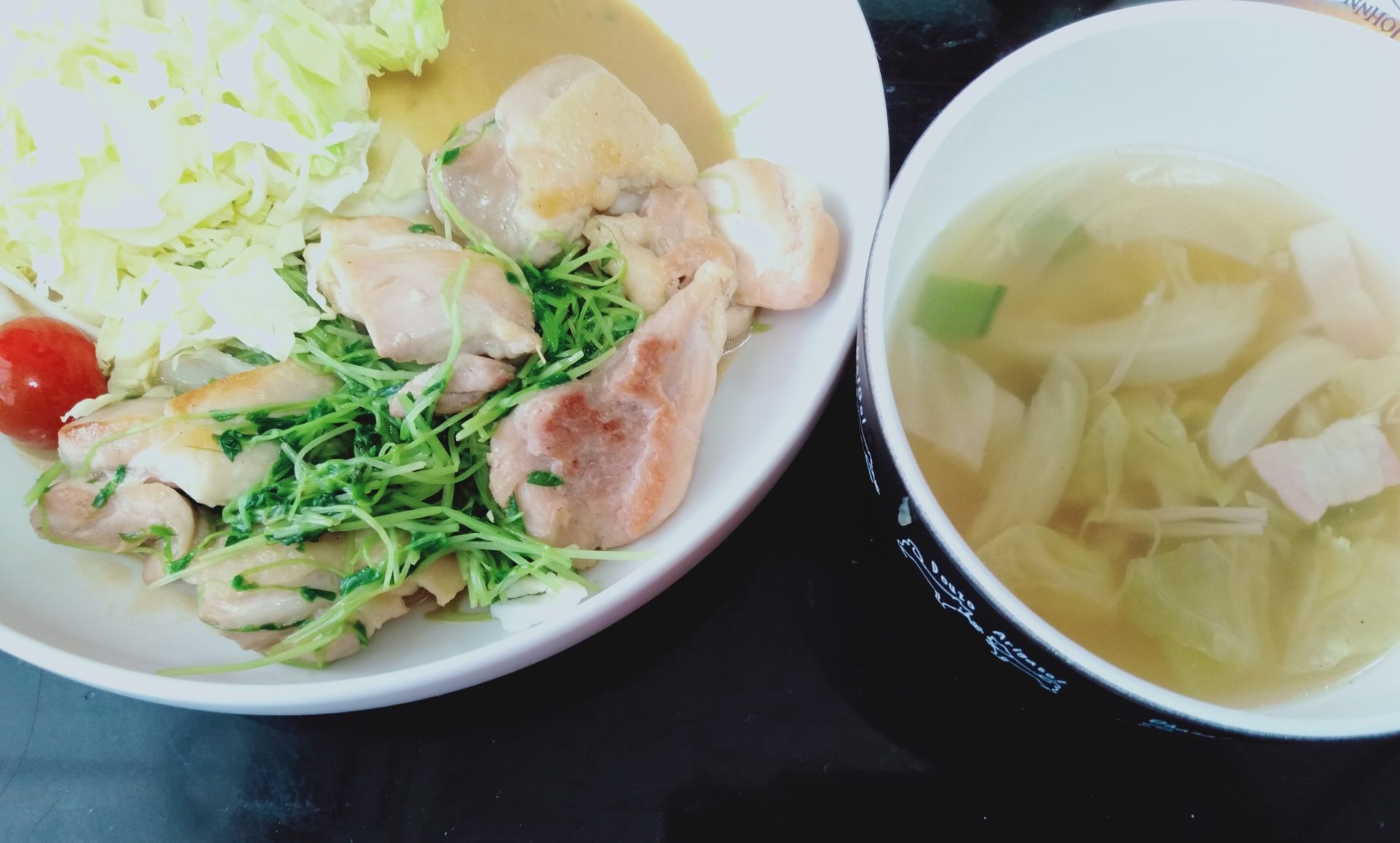 夕食は、豆苗が余っていたので、鶏モモと、豆苗の醤油マヨ炒めと、キャベツサラダ、ミニトマト、ベタ豆とキャベツのコンソメスープです
