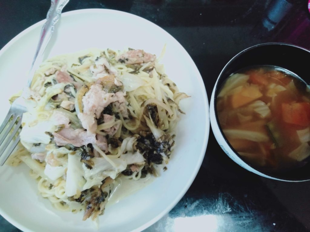 夜は、紀文の糖質0g麺を使用し、高菜漬けを使用し、高菜と豚肉の豆乳クリームパスタ。