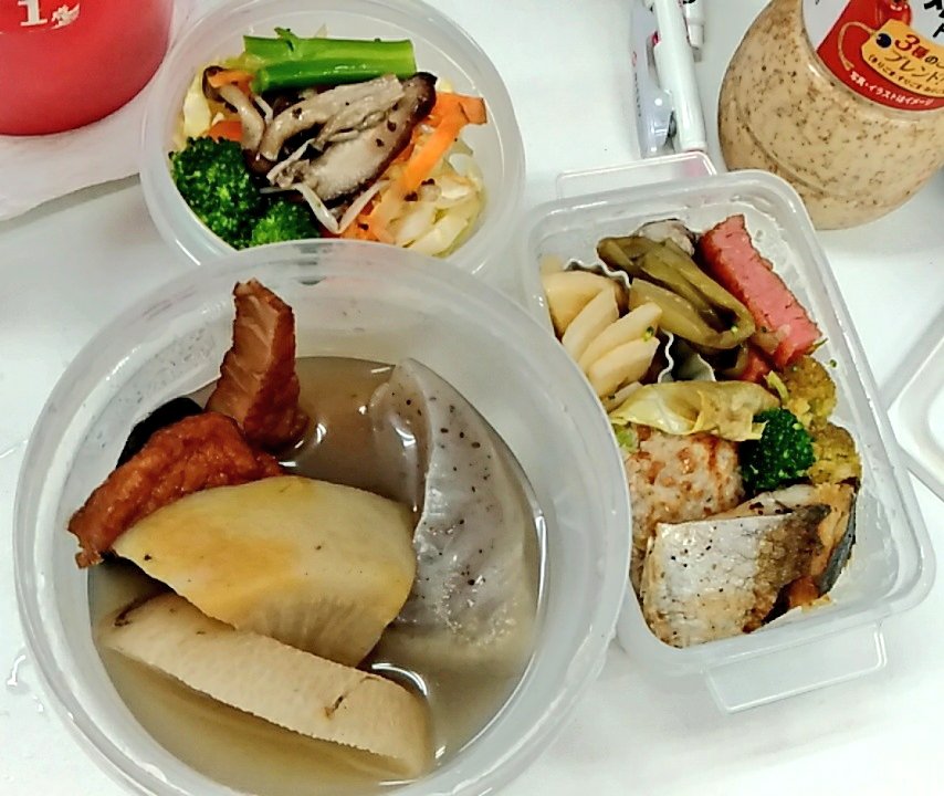 冷蔵庫の中身減らしたくて詰め込んだ感、、全部は食べれない気が、、と思ってたら、結局おなかいっぱいになり、サラダを会社の冷蔵庫に、、